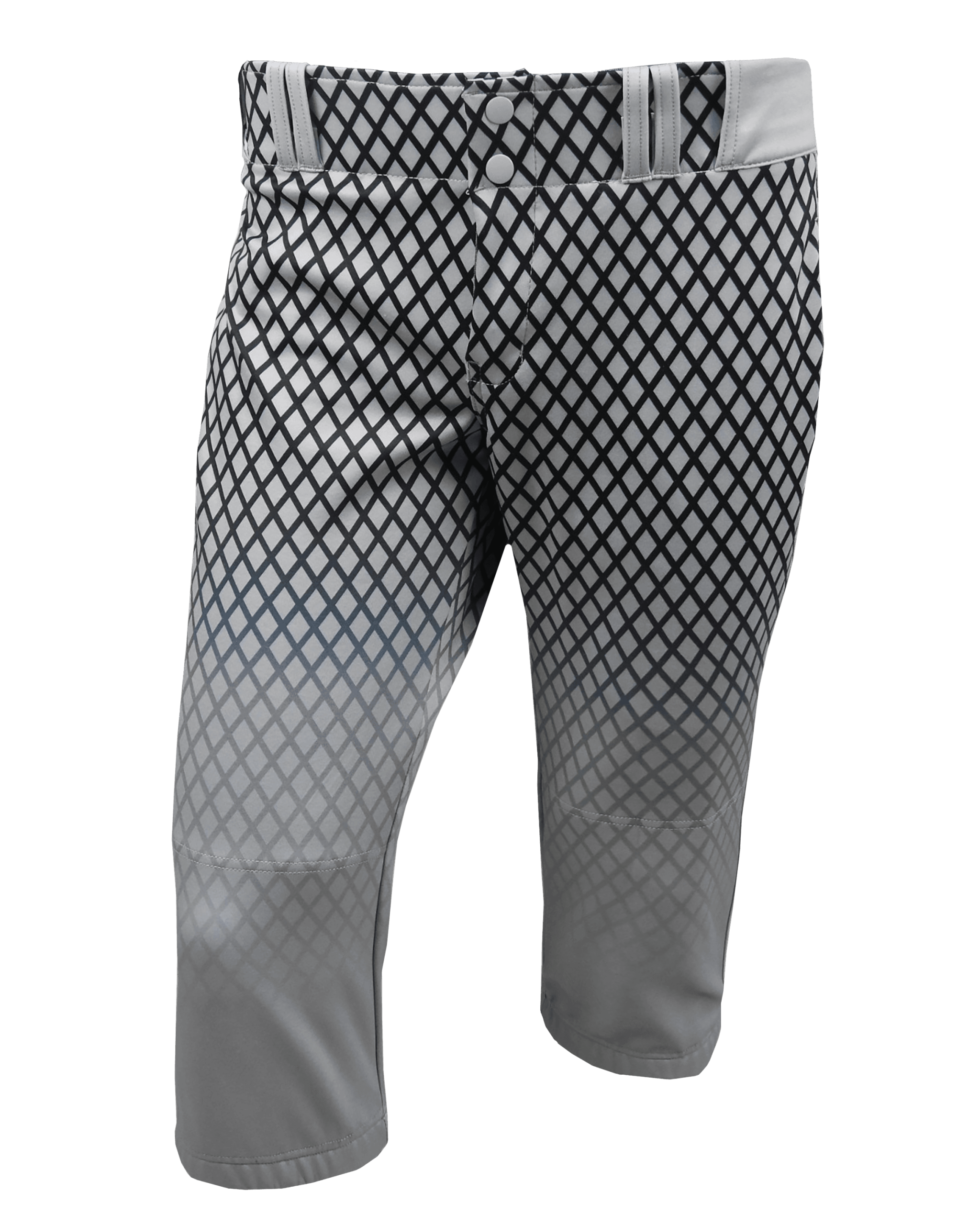 Our Knicker Softball Pants are a traditional knicker style pant with a tapered leg pattern, an elastic leg opening, and pockets on each side. These pants cut off just below knee as opposed to mid calf cutoff of our lowrise pants. Features cover-stitched seams. These pants can be customized with unlimited decoration.
